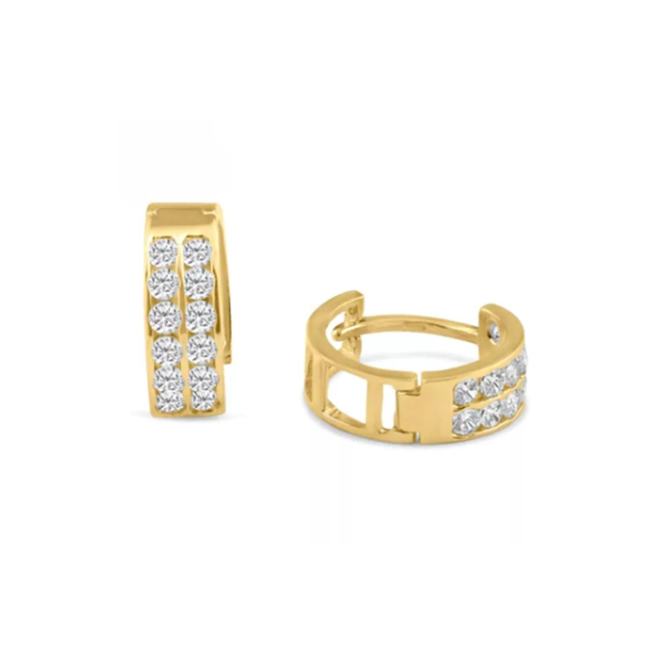 14K Yellow or White Gold Huggie Hoop Earrings with Two Rows of 14 Round Cut Cubic Zirconia